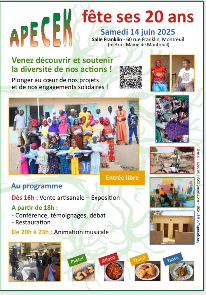 C’est dans ce contexte que nous souhaitons faire des 20 ans d’APECEK un moment de rassemblement, de communion de l’ensemble des acteurs, de France et du Sénégal équipes gestionnaires, bénéficiaires, familles, établissements d’accueil des élèves mais aussi tous les membres, parrains, marraines et sympathisants. Nous vous invitons ainsi à participer à deux temps forts: